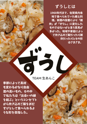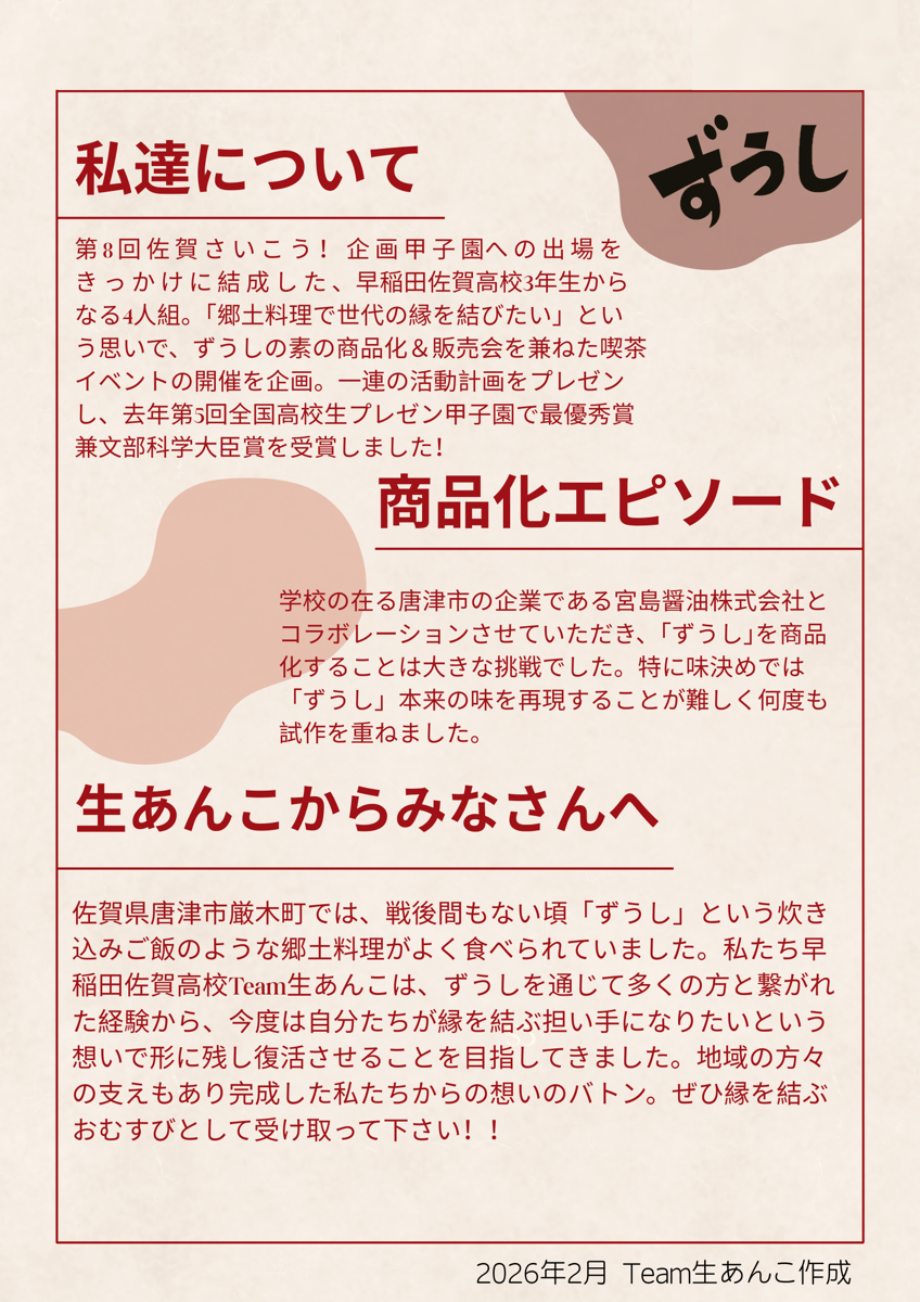 「第8回佐賀さいこう!企画甲子園」への出場をきっかけに結成した、早稲田佐賀高校3年生からなる4人組「Team生あんこ」。「郷土料理で世代の縁を結びたい」という思いで、「ずうしの素」の商品化&販売会を兼ねた喫茶イベントの開催を企画。一連の活動計画を「第5回全国高校生プレゼン甲子園」で発表し、最優秀賞兼文部科学大臣賞を受賞しました!